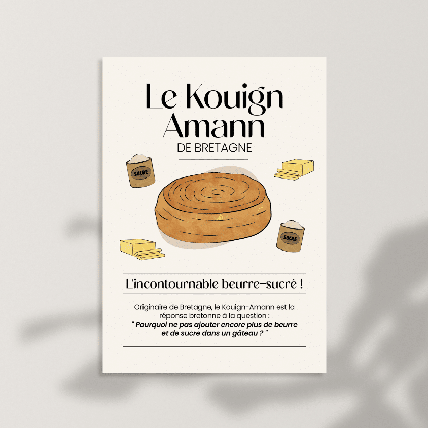 Ajoutez une touche sucrée à votre déco avec cette affiche du Kouign-Amann. L’illustration met en valeur cette spécialité bretonne, alliant pâte feuilletée, beurre et sucre. Disponible en plusieurs tailles et imprimée sur un papier de qualité, avec option cadre prêt à accrocher.