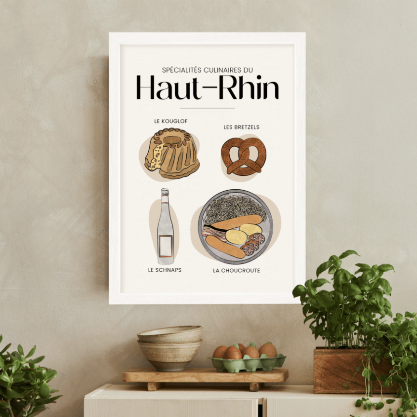 Cette affiche élégante met en lumière ces trésors culinaires, parfaits pour tous les amoureux de l'Alsace et de sa gastronomie. Disponible en plusieurs tailles, avec option de cadre pour une touche raffinée, elle apportera une note gourmande et authentique à votre intérieur. Un véritable hommage aux traditions du Hauts-Rhin !